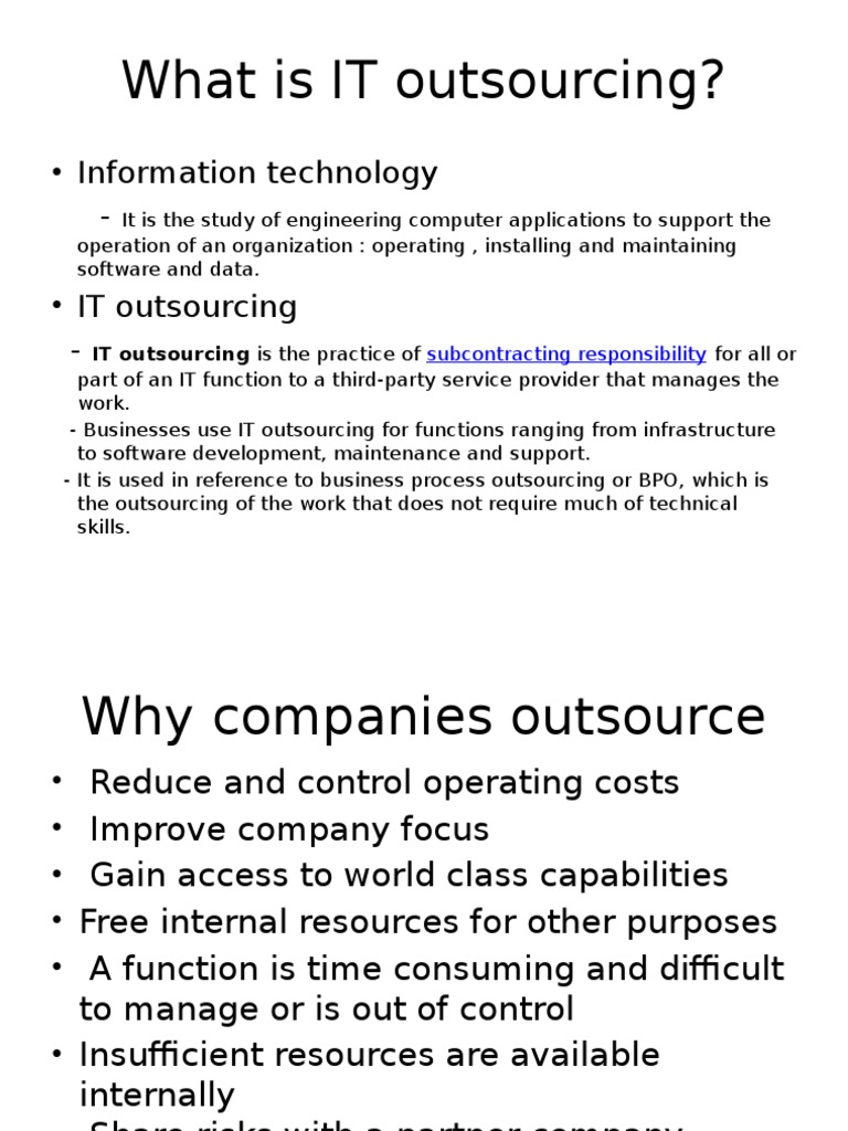 Outsourcing is considered a comprehensive cost-cutting strategy by a business that seeks to allocate out entire jobs or departments within a firm to an external firm permanently. IT outsourcing is the practice of using an external service provider to deliver some or all of the IT functions required by a business including managing infrastructure directing strategy and running the service desk. Companies Have Started to Hire.