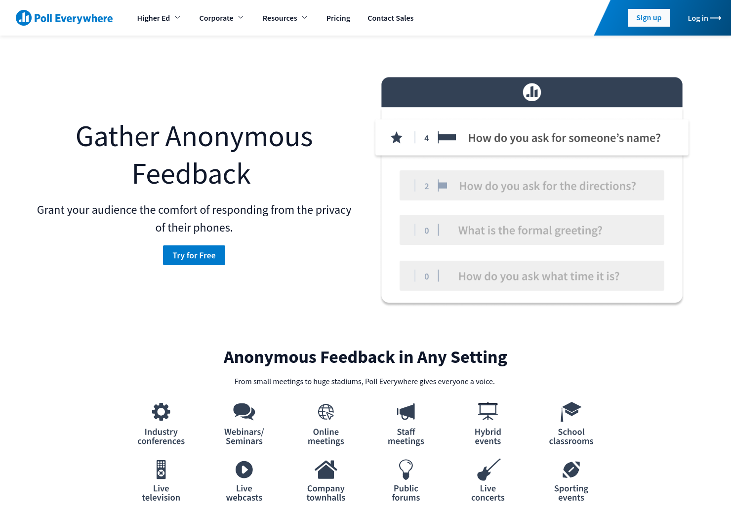 Particularly useful when running opinion polls facilitating QA and running pulse surveys as part. A live polling QA and survey app like Vevox is designed to collect truly anonymous feedback even when working with authenticated platforms such as Microsoft Teams. Anonymous feedback in any setting From small meetings to huge stadiums Poll Everywhere gives everyone a voice.